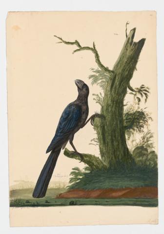 Drawing of a Smooth-billed Ani from a 18th century specimen [modern geographical distribution: Florida, Caribbean, Central America, and South America. Also attributed to Collins, Charles].