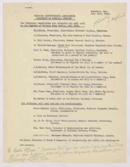 Edward S. Winslow correspondence and drafts regarding the Canadian Manufacturing Association's Committee for National Defence delegation to England, departing July 29, 1939, and returning 7 September, 1939. Includes schedules of meetings with British officials and factory tours, reports and notes from these meetings, lists of members of the delegation and committees, invitations to clubs and dinners, a draft of an article about the potential role of Canadian manufacturing if there were to be a war, and a circular summarizing the creating of the Committee for National Defence's creation and activities.