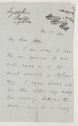 Letter from R. Lydekker to John William Dawson, written from The Lodge, Harpenden, Herts.