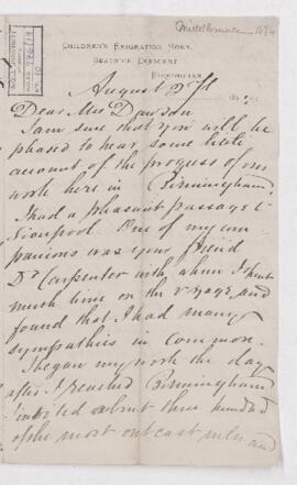 Letter from John T. Middlemore to Margaret Mercer Dawson, written from Birmingham. Written on letterhead of the Chidlren's Emigration Home.