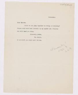 Letter to H.C. Yarrow from William Osler. Arrangements to play [golf?]. Additional notes by William Francis.